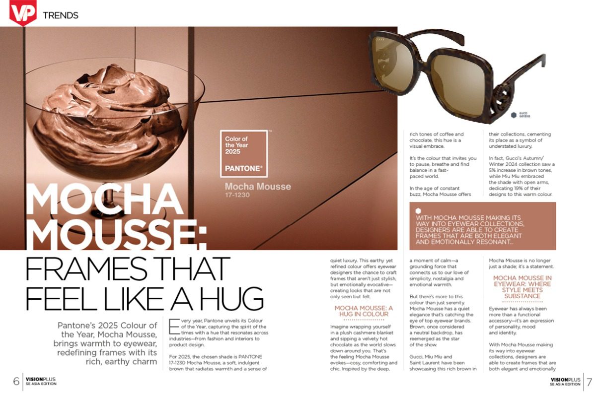 In the age of constant buzz, Mocha Mousse offers a moment of calm—a grounding force that connects us to our love of simplicity, nostalgia and emotional warmth. But there’s more to this colour than just serenity. Mocha Mousse has a quiet elegance that’s catching the eye of top eyewear brands. Brown, once considered a neutral backdrop, has reemerged as the star