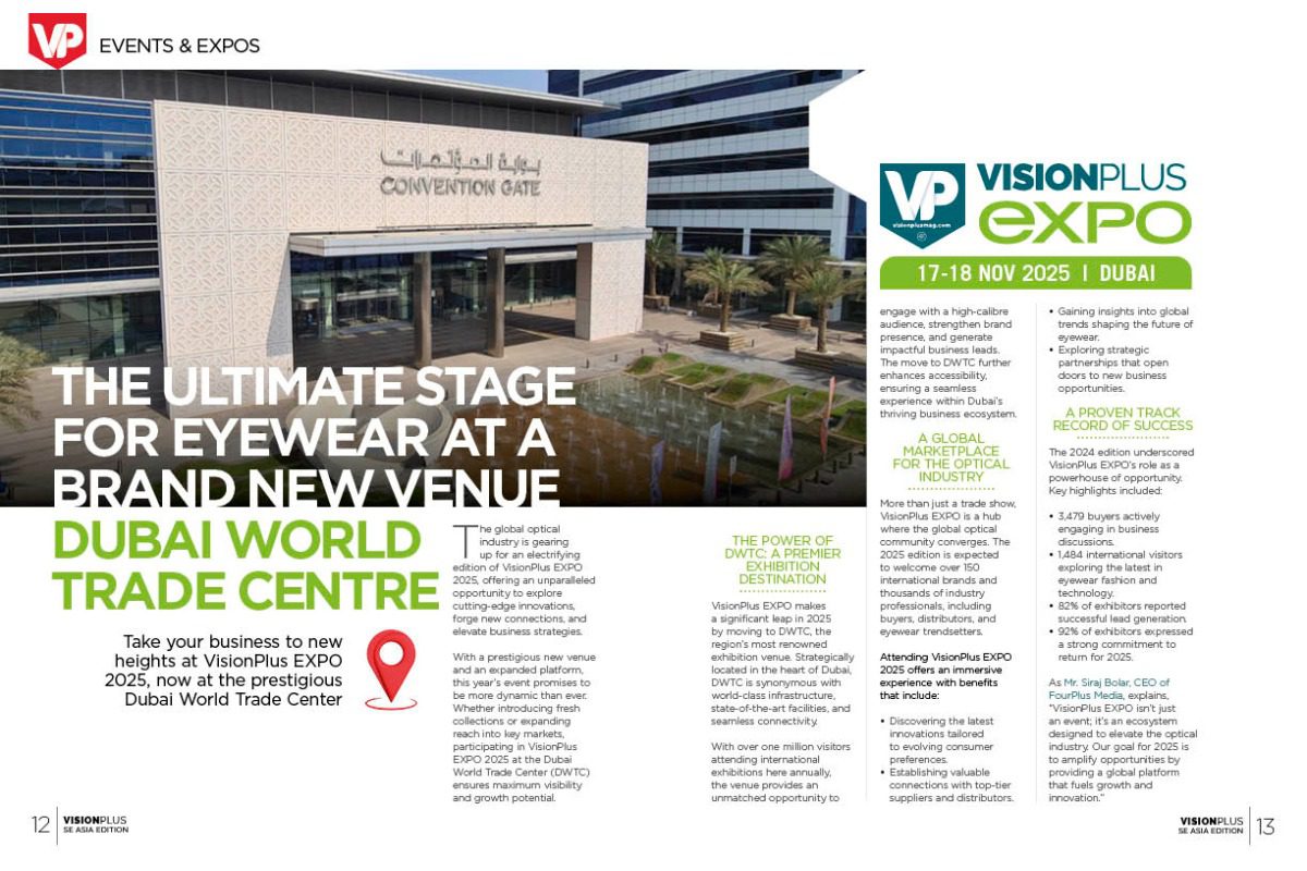 The global optical industry is gearing up for an electrifying edition of VisionPlus EXPO 2025, offering an unparalleled opportunity to explore cutting-edge innovations, forge new connections, and elevate business strategies. With a prestigious new venue and an expanded platform, this year’s event promises to be more dynamic than ever. Whether introducing fresh collections or expanding reach into key markets, participating in VisionPlus EXPO 2025 at the Dubai World Trade Center (DWTC) ensures maximum visibility and growth potential.