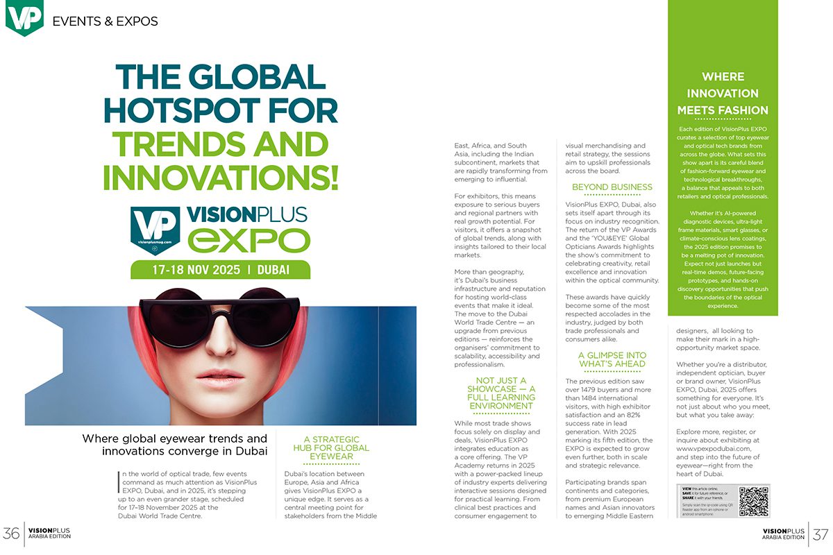 VisionPlus EXPO, Dubai, also sets itself apart through its focus on industry recognition. The return of the VP Awards and the ‘YOU&EYE’ Global Opticians Awards highlights the show’s commitment to celebrating creativity, retail excellence and innovation within the optical community.