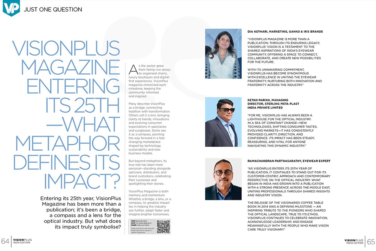 “As VisionPlus enters its 25th year of publication, it continues to stand out for its customer-centric approach and contemporary perspective on the optical industry. What began in India has grown into a publication with a strong presence across the Middle East, uniting professionals through shared insights and industry vision.