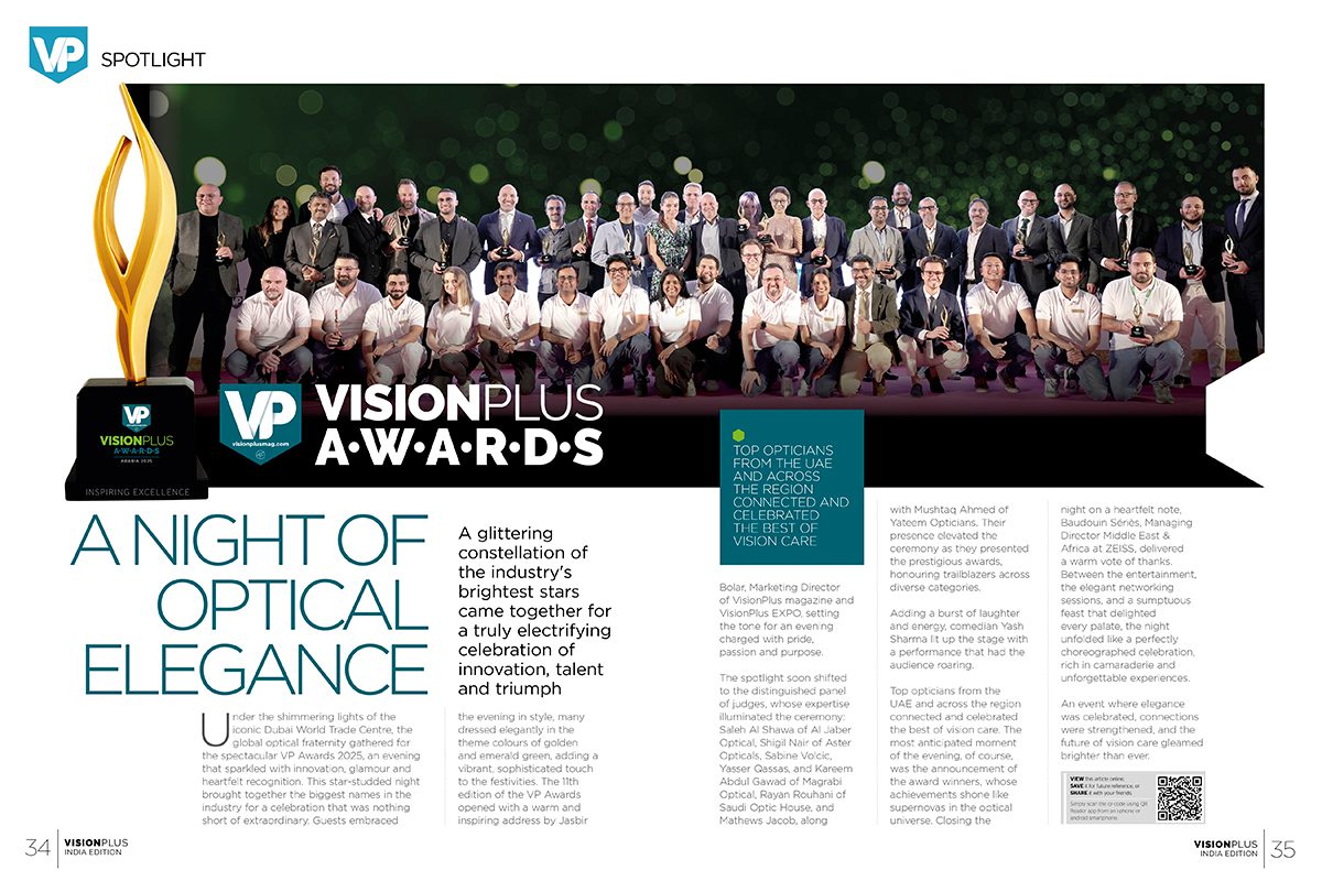 Under the shimmering lights of the iconic Dubai World Trade Centre, the global optical fraternity gathered for the spectacular VP Awards 2025, an evening that sparkled with innovation, glamour and heartfelt recognition. This star-studded night brought together the biggest names in the industry for a celebration that was nothing short of extraordinary. Guests embraced the evening in style, many dressed elegantly in the theme colours of golden and emerald green, adding a vibrant, sophisticated touch to the festivities. The 11th edition of the VP Awards opened with a warm and inspiring address by Jasbir Bolar, Marketing Director of VisionPlus magazine and VisionPlus EXPO, setting the tone for an evening charged with pride, passion and purpose.