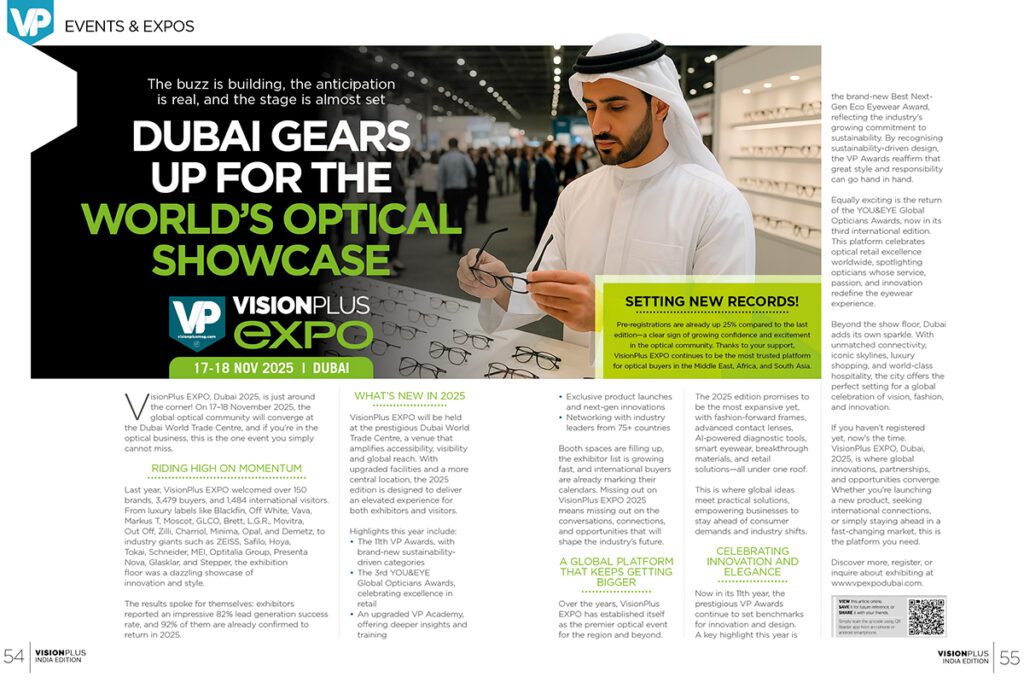 Mark your calendar as VisionPlus EXPO returns on 17–18 November 2025 at the Dubai World Trade Centre. On the horizon, we also celebrate the 11th edition of the VP Awards and the 3rd ‘YOU&EYE’ Global Opticians Awards.