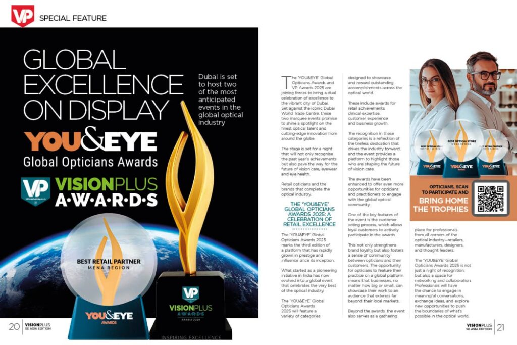 Amidst the buzz of the VisionPlus EXPO, Dubai, brace yourself for two other exciting events – The 11th edition of the VP Awards and the 3rd edition of The ‘YOU&EYE’ Global Opticians Awards, celebrating another year of excellence in the industry!